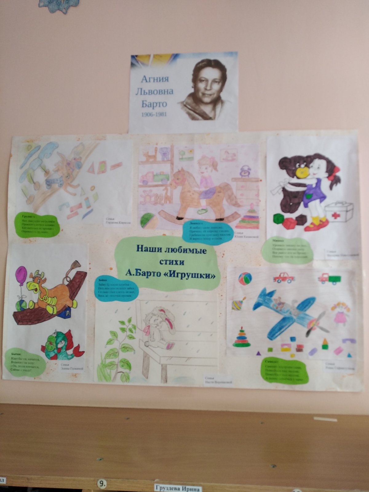 В группе "Малинка" прошла тематическая неделя, посвящённая юбилею поэтессы А. Л. Барто. Вместе с детьми читали и заучивали стихи из цикла "Игрушки", рассматривали иллюстрации, пели песенки о любимых игрушках, играли с ними. Наши родители участвовали в оформлении газеты "Наши любимые стихи. А. Барто " Игрушки ". В завершении недели было проведено развлечение"С игрушками мы дружим, в хороводе их закружим".