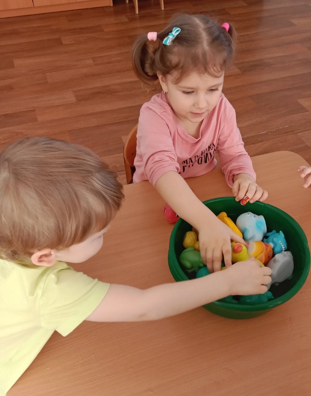 Маленькие исследователи из группы "Вишенка" знакомились со свойствами воды. Опытным путем выясняли: какие предметы тонут, а какие нет.