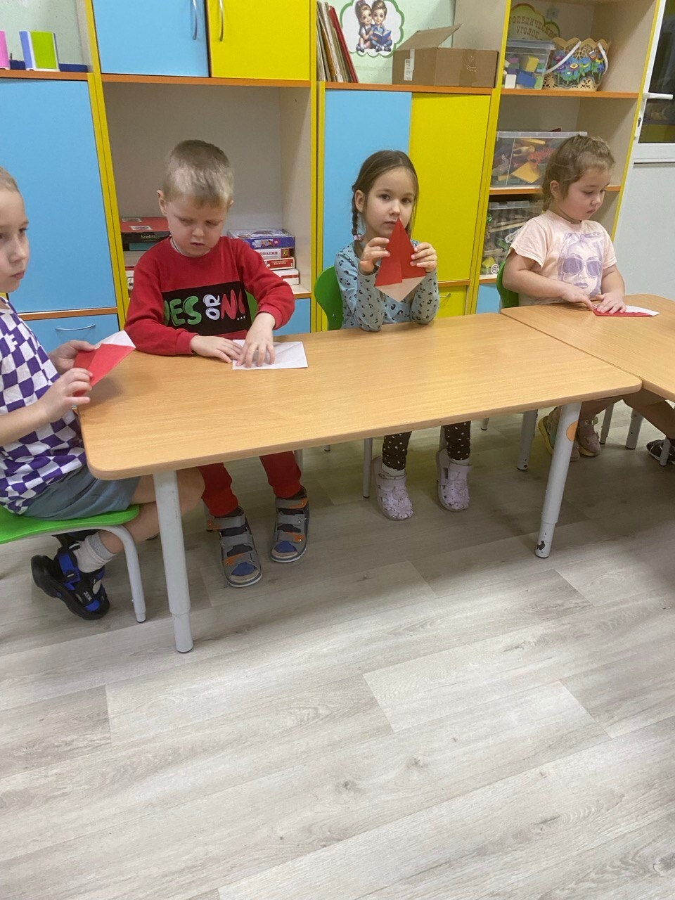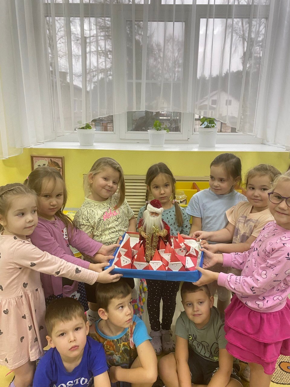 После познавательной беседы мы приступили к творческой работе. Дети выполняли оригами из цветной бумаги. В результате у каждого ребёнка получились Дедушки Морозы.Они были очень забавные и смешные.